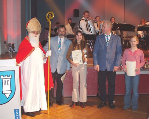 Zwischen den Stücken erschien St. Nikolaus in der Stadthalle. Nach seinen ganzjährigen Beobachtungen hatte er viel zu berichten und es gab Tadel und auch Lob. An alle Spielerinnen und Spieler verteilte er kleine Geschenke. Der Ausbildungsleiter und Dirigent Bernd Steinbrenner wurde mit einem Präsent überrascht. |