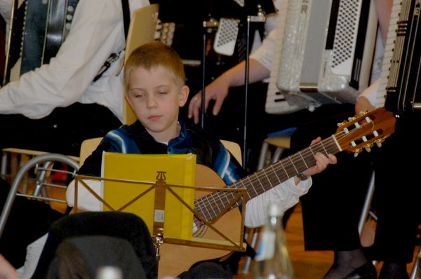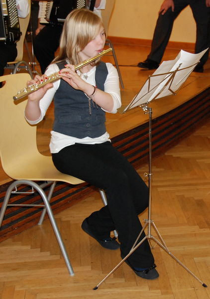 Mit den Stücken "Hijo de la luna" und "O du fröhliche" ging es im weihnachtlichen Teil weiter. Das 1. Orchester wurde bei den Stücken "In der Weihnachtsbäckerei" und "Jingle Bells" durch Spielerinnen und Spieler vom Unterricht sowie von Ann-Sophie Reiser mit Ihrer Querflöte unterstützt, die zum Teil das erste Mal eine Bühnenpremiere hatten. St. Nikolaus hatte sich auch wieder angekündigt und konnte vieles Neues und Interessantes vom Vereinsjahr 2008 berichten. Auch in diesem Jahr hatten viele Jugendliche den Mut St. Nikolaus in vielfältiger weiße etwas zu gehör zu bringen. |