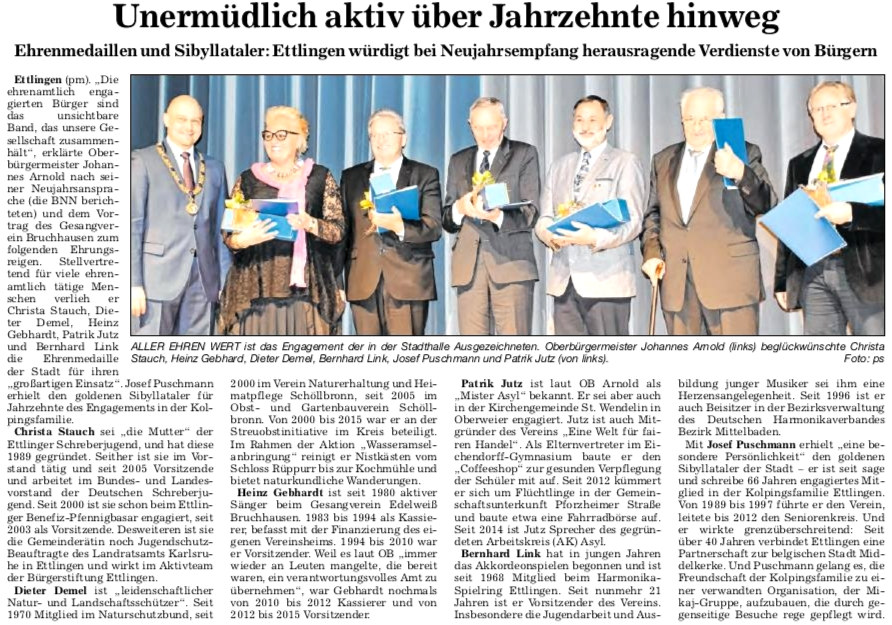 Traditionell erhalten auf dem Neujahrsempfang der Stadt Ettlingen besonders engagierte Ettlinger Bürger die Ehrenmedaille der Stadt Ettlingen. Bernhard Link hat in den jungen Jahren Akkordeonspielen begonnen und ist seit 1968 Mitglied beim Harmonika-Spielring Ettlingen, wo er sich ab dem Jahr 1982 in der Vorstandschaft eingebracht hat. 1992 übernahm er zunächst das Amt des 2. Vorsitzenden, ab 1994 und damit seit 21 Jahren ist er 1. Vorsitzender und hat den Harmonika-Spielring wesentlich geprägt. Das 75-jährige Jubiläum des Vereins fand 2009 unter seiner Regie statt. Die Jugendarbeit und die Ausbildung junger Musiker ist ihm eine Herzensangelegenheit. Der Harmonika-Spielring wirkt regelmäßig bei Konzerten und städtischen Veranstaltungen musikalisch mit. Auch am Ettlinger Ferienpass beteiligt sich der Verein jährlich. 2008 wurde er zum Ehrenmitglied des Harmonika-Spielrings ernannt und seit 1996 ist er darüber hinaus Beisitzer in der Bezirksverwaltung des Deutschen Harmonika Verbandes für den Bezirk Mittelbaden in Trossingen. |