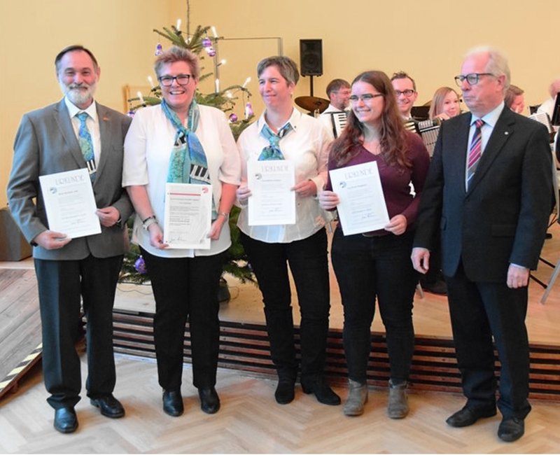 Nach einer kurzen Umbauphase eröffnete das 1. Orchester unter der Leitung von Bernd Steinbrenner den weihnachtlichen Teil des Nachmittags. Unter dem Programmpunkt "Lampenfieber" spielten Luise Kimmig und Noemi Mobilio (jeweils auf dem Akkordeon) und Berenike Kimmig (auf der Gitarre) für die Gäste weihnachtliche Stücke. Mit viel Applaus und einem kleinen Geschenk wurden sie belohnt. Nach einigen weihnachtlichen Stücken und Liedern überreichte Bernhard Link an die Spielerinnen und Spieler vom 1. Orchester, der Akkordeongruppe Steinbrenner, den Unterrichtsteilnehmern, der Gesamtverwaltung sowie Bernd und Margret Steinbrenner ein Präsent.