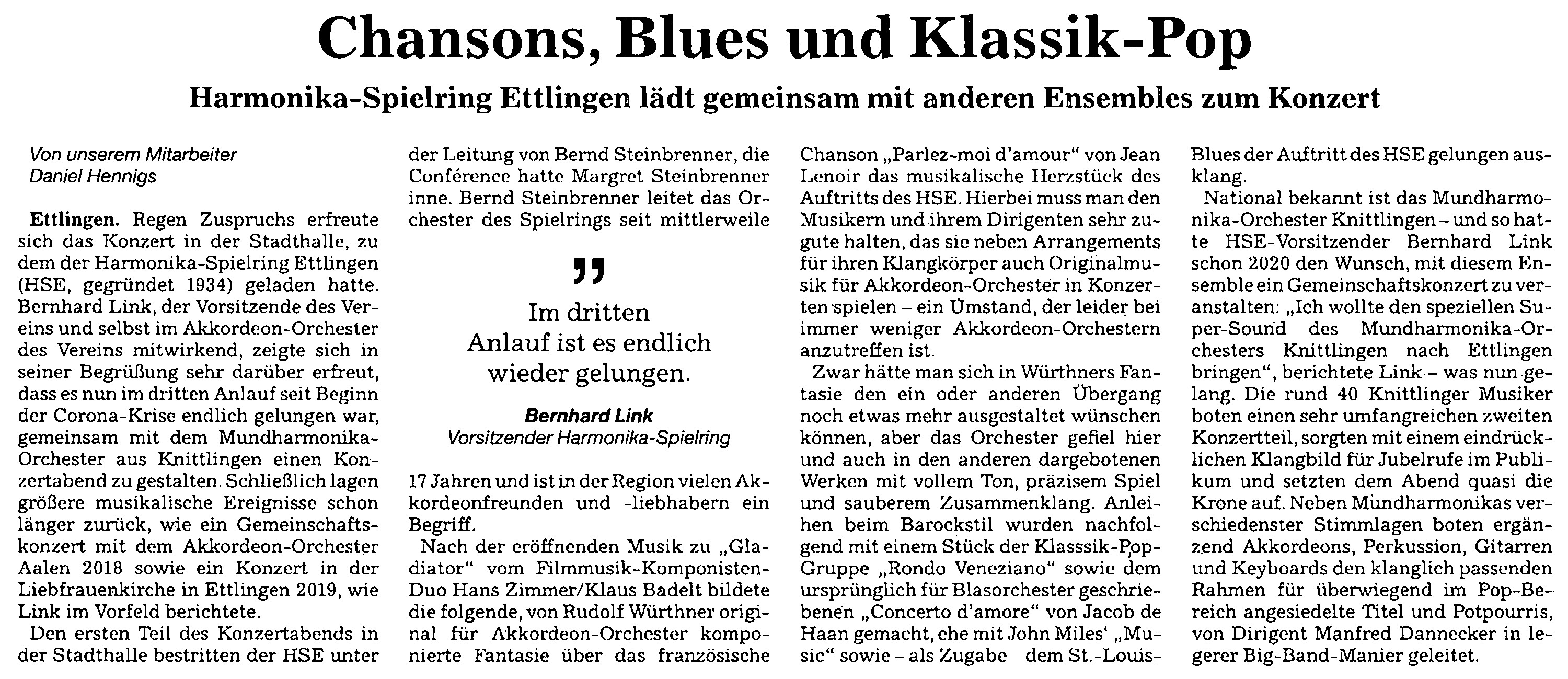 Am 1. Oktober 2022 fand das geplante Konzert vom 10. Oktober 2020 des Harmonika-Spielring Ettlingen endlich in der Stadthalle Ettlingen statt. In der gut besuchten Stadthalle konnte Bernhard Link - Vorsitzender - nicht nur zahlreiche Gäste, sondern auch das Mundharmonika-Orchester Knittlingen mit seinem Dirigenten Manfred Dannecker, die 1. Vereinsvorsitzende Bettina Reneaux sowie die 2. Vereinsvorsitzende Andrea Feind begrüßen. Ein besonderer Willkommensgruß ging an die Stellvertreterin des Oberbürgermeisters Johannes Arnold Frau Christa Stauch, den Ehrendirigenten Peter Wucknitz mit seiner Frau Brigitte, Ehrenmitglied Hubert Geyer mit seiner Frau Irene, alle Ehrenmitglieder, und Herrn Daniel Hennigs von den BNN. Danach übergab Bernhard Link das Mikrofon an Margret Steinbrenner, sie führte das Publikum mit präzisen Einzelheiten zu den Musikstücken durch den ersten Programmteil.