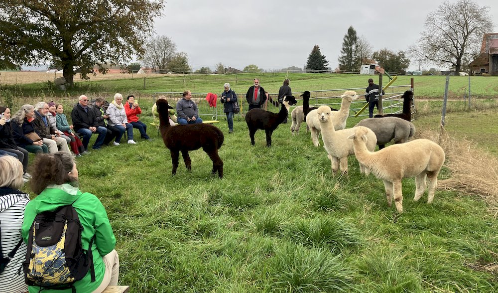 Weiter ging es nach Kapellen-Drusweiler zum Weinhaus der Familie Schowalter. Dort erwartete uns eine einstündige Alpakawanderung. Die sehr ausführliche Einführung von Frau Schowalter zum Umgang mit den Alpakas war aufschlussreich und faszinierend.