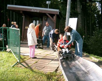 Bei herrlichem Sonnenschein fuhr der HSE mit 16 Jugendlichen am Samstagmorgen, 08.10.2006 ins Poppeltal (Enzklösterle) zur Riesenrutsche. Nach einigen technischen Anweisungen und der Einteilung Einzel- oder Doppelbob konnten die Fahrten beginnen. Es gab einige gemütliche aber auch nach einer ersten Schnupperfahrt rasante Fahrer. Nach einer kurzen Mittagspause (mit Mohrenköpfen als Nachtisch) ging die Fahrt wieder in Richtung Heimat. |