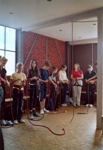 Doch der Tag war noch nicht zu Ende, denn die HSE-Gruppe war von 14 bis 16 Uhr im Kletterzentrum "The Rock" Karlsruhe angemeldet. Der Sicherheitschef "Stefan" gab den Jugendlichen gezielte Anweisungen, wie man sich in der Kletterhalle zu verhalten hat. Nach Anlegung des Sicherheitsgurtes lernten die "Kletterer" den Achterknoten. Die Erwachsenen, die sich bereit erklärten zu "Sichern" bekamen eine besondere Einweisung mit dem "Halbmastwurf-Knoten", danach wurde erst an der Kletterwand die Sicherung geübt. Erst jetzt konnten die Jugendlichen nach Lust und Laune an den verschiedenen Kletterwänden ihre Geschicklichkeit, Kraft und Können unter Beweis stellen. Aber auch diese zwei Stunden vergingen wie im Flug und man musste schon bald wieder die Heimfahrt nach Ettlingen antreten. |